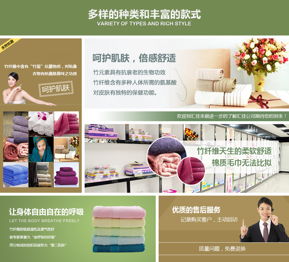 德州匯佳紡織品有限公司專業(yè)生產(chǎn)竹纖維毛巾,是竹纖維毛巾品牌廠家,并且提供竹纖維毛巾禮盒套裝用于福利和禮品。公司座落于山東德州,交通十分便利,公司近臨京滬高速公路,距離德州火車站、汽車站10公里京滬高鐵5公里,濟南國際機場120公里。
